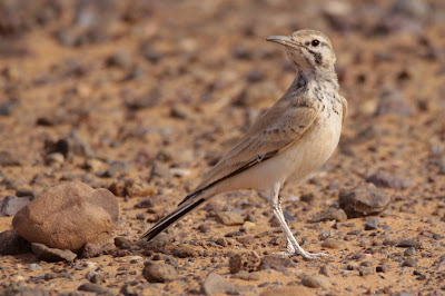 I did the right thing going with this guy. First we stopped off at his house at Merzane and were unsuccessful in finding the Fulvous Babblers that are always there. Then, in his 4x4, we went looking for desert species. We went out onto a stony desert and immediately got a Hoopoe Lark. 'Desert Wheatear!' Sure enough there was a cracker of a male and later on we saw three more males. We tried a dune area with scrub and within seconds of Lahchen playing a song of the warbler, we got 2 Desert Warbler! They showed well but not for the camera. Then I picked up another and watched it go into cover only to see a second bird join it. If that wasn't enough, I could see a darker sylvia warbler with a longer tail inside the same bush, Tristam's Warbler and that was also joined by a second bird! I didn't know which way to look and after a few minutes the deserts showed superbly. However, the 2 Tristram's Warbler were staying deep in cover. I returned to Lahchen and in front of me out in the open was a Tristram's and a Desert Warbler! How many were there in this area?